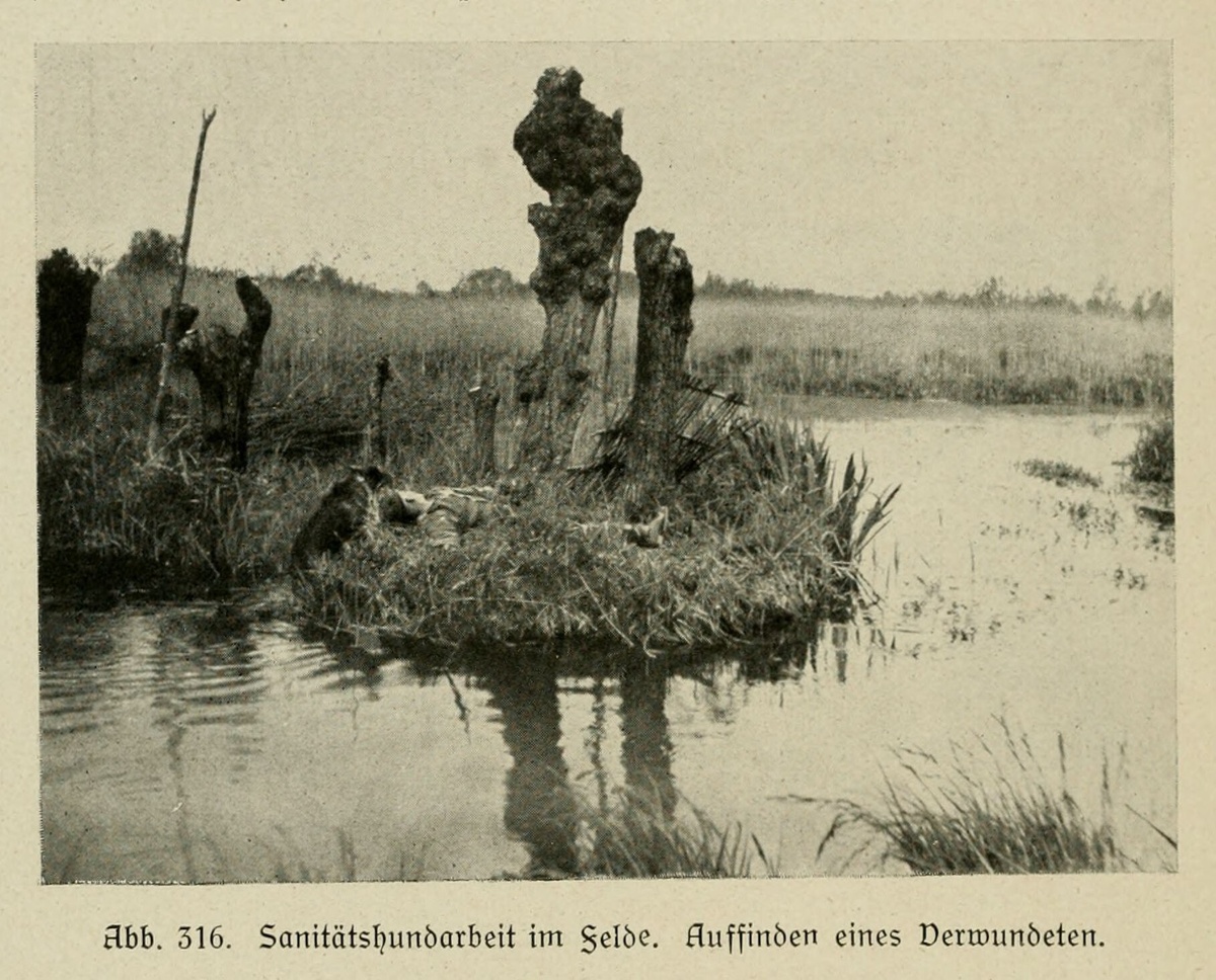Работа санитарной собаки в полевых условиях. Нахождение раненого. Иллюстрация из книги 1921-го года издания "Немецкая овчарка в описаниях и изображениях" Макса фон Штефаница.