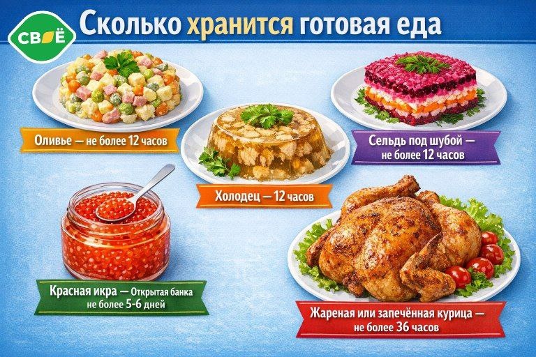 Новый год наступил, и чтобы выходные не превратились в кошмар, напоминаю, что традиция готовить впрок и доедать новогодние угощения в течение многих дней может быть опасна. Сколько и как хранить праздничную еду? Съесть готовые салаты оливье и селёдку под шубой лучше всего в первые сутки после приготовления. Заблаговременно нарезать их не получится – с каждым днём в блюдах снижается количество витаминов, а вот число бактерий увеличивается. Для салатов из свежих овощей и фруктов срок хранения и того меньше – всего 12 часов. Подробнее о сроках — на инфографике. Все готовые блюда после праздника нужно хранить в холодильнике в закрытых контейнерах или под плёнкой, не перегружая из посуды в посуды, и заправляя перед подачей. Осторожнее всего следует обращаться с рыбными блюдами, проверяя их запах, вид и вкус. Нужно помнить, что время жизни любимых салатов зависит от ингредиентов. Например, горошек или фасоль советуют добавлять перед подачей на стол для большей их свежести, а первыми в салат