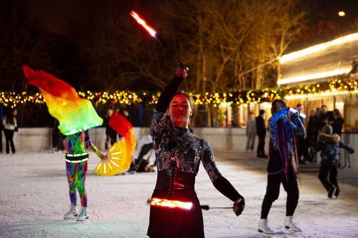 В этом зимнем сезоне одна из самых популярных ледовых площадок города впервые расположена прямо перед Главным входом в центральный парк Москвы. Посетители скользят вокруг сияющей новогодней ели с видом на знаменитую достопримечательность города.