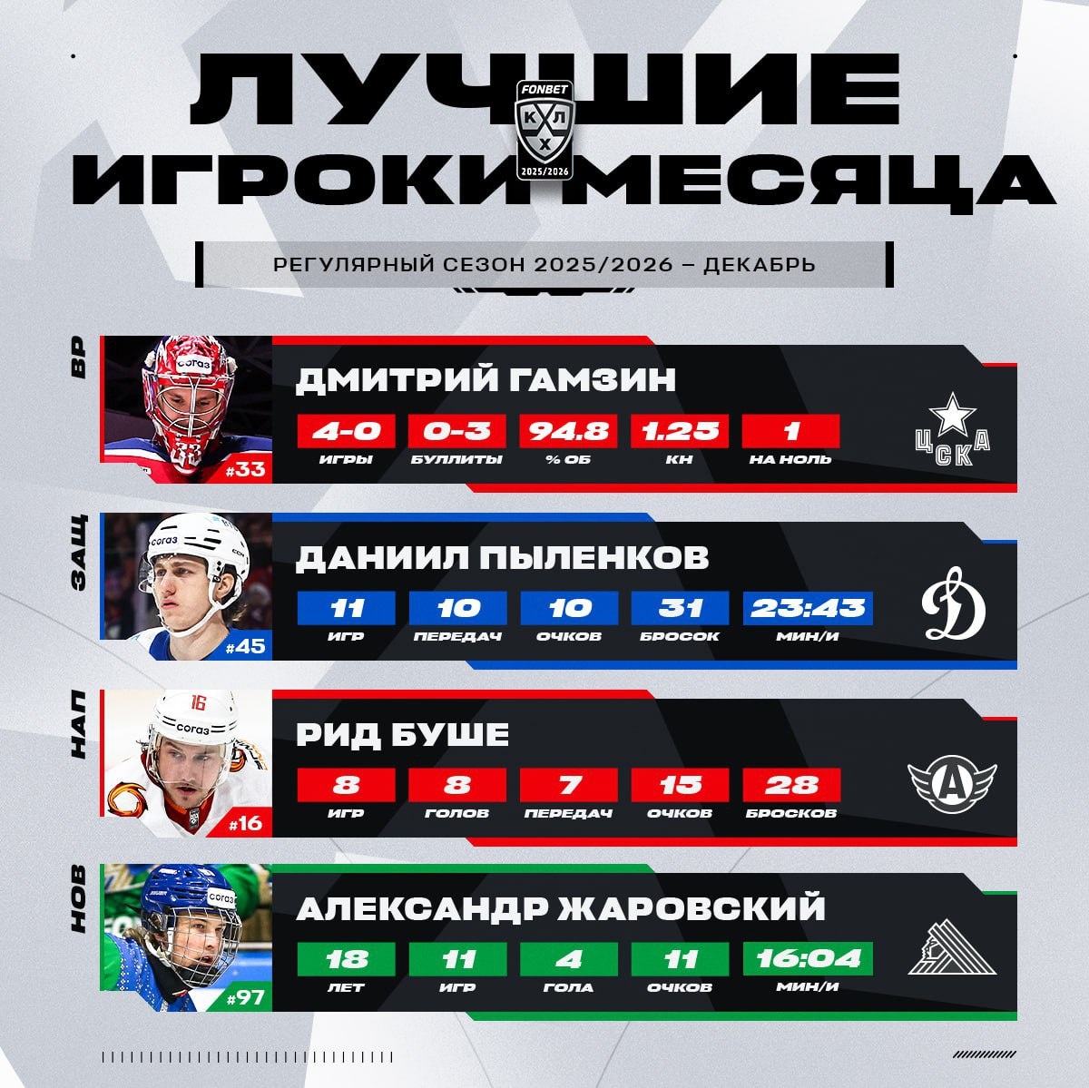 Привет, друзья! Кто стал главным героем декабря в КХЛ? Три неожиданных победителя! Но давайте разберёмся, что это значит для любителей хоккея и какие выводы можно сделать из этих достижений. Лучшим вратарём признан Дмитрий Гамзин из ЦСКА. Его коэффициент надёжности в 1,25 говорит о том, что он был практически непробиваем. Но давайте задумаемся: насколько это важно для команды в целом? Ведь вратарь — это не только индивидуальные достижения, но и часть стратегии защиты. Лучшим защитником стал Даниил Пыленков из московского «Динамо». Его 10 очков в 11 матчах — это не просто цифры, это показатель того, что защита может быть не только надёжной, но и результативной. Но что это значит для развития хоккея? Может ли это изменить подход к выбору тактики и стратегии в защите? Лучшим нападающим признан Рид Буше из «Автомобилиста». Его 15 очков в 8 матчах — это яркий пример того, как один игрок может внести значительный вклад в успех команды. Но насколько это зависит от его личных качеств и насколь