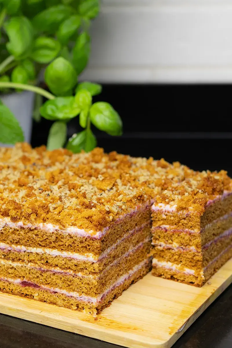Этот торт получается мягким и воздушным с самого начала, и вам не нужно ждать, пока слои размякнут, как в случае со стандартным медовым тортом. Объем моего стакана составляет 240 мл. Для начинки торта «Мадлен» можно использовать любое варенье или джем, или же можно вообще обойтись без него и начинить торт только кремом. Торт вкуснее всего после двух дней в холодильнике, когда ароматы отдельных слоев успевают настояться, но при желании его можно съесть и сразу после приготовления. 150 гр. сливочного масла чуть больше 1/2 стакана натурального меда (180-200 г) 1,5 чайные ложки пищевой соды (8 г) 4 яйца полная чашка сахарной пудры (150 г) щепотка соли 1 и 2/3 стакана пшеничной муки типа (250 г) 700 г сметаны 18%, хорошо охлажденной 1/3 – 1/2 стакана сахарной пудры (60 г, по вкусу) 1 столовая ложка ванильного сахара или ванильного экстракта 200 гр. любого варенья без косточек (лучше вишневое, виноградное или из красной сливы) Ингредиенты для теста должны быть комнатной температуры.