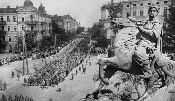 В Москве «парад» побежденных немцев прошел 17 июля 1944 года. В нем приняло участие 57 600 военнопленных. В Киеве марш пленных немцев состоялся через месяц — в среду 16 августа 1944 года. Он был скромнее московского. Колонна военнопленных в составе 36 918 человек, в том числе 549 офицеров, шла по городу с 10:00 в течение 5 часов. Не догнав Москву по масштабности «парада», Хрущев – уже на то время руководившей Украиной – придумал маршрут марша, вдвое длиннее московского – 21 км!