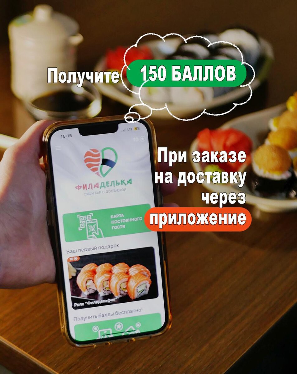 "! 🎉🍣 Друзья, встречайте новый год с радостью и бонусами от нашего любимого суши-бара «Филаделька» 😋 ✨ Мы решили сделать вам новогодний подарок: весь январь при каждом заказе на доставку через наше приложение мы добавляем целых 150 дополнительных баллов. Просто представьте себе этот волшебный фейерверк из бонусов прямо у вас в телефоне! 📲 Чтобы получить свои новогодние подарки, просто скачайте или откройте наше приложение по ссылке: https://referral.loyaltyplant.com/lp/sushibarinyan Затем сделайте заказ своих любимых роллов, а наши дополнительные бонусы появятся там сами собой – никаких лишних движений, всё будет быстро и удобно 😌 Итак, приготовьтесь к тому, что каждый ваш заказ станет еще вкуснее и приятнее благодаря нашим новогодним сюрпризам! 👀😉 Не упустите возможность начать Новый год вкусно и выгодно вместе с нами! Ждём вас за праздничным столом ❤️ С любовью, команда "Филадельки".