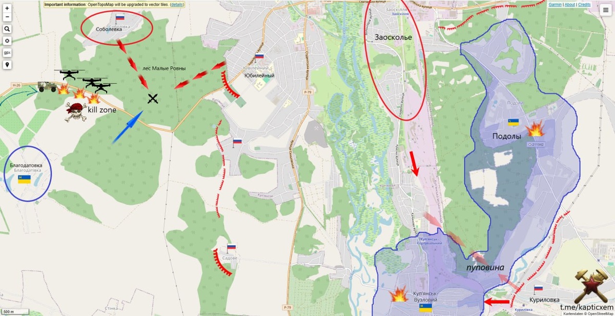 ВСУ в районах населенных пунктов Нечволодовка и Благодатовка с целью прорыва в город Купянск Харьковской области. Уничтожено до 15 боевиков и два пикапа. Вот про Благодатовку у Генштаба- это как раз описываемая килл-зона в статье