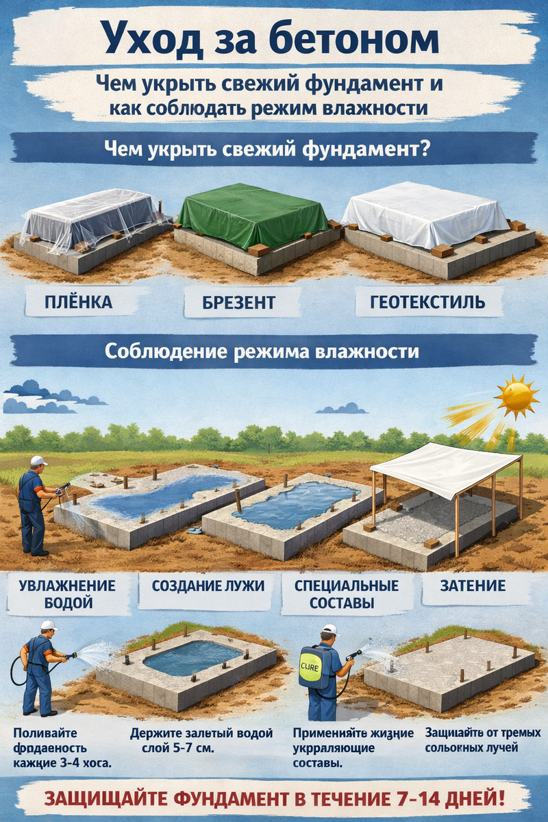и всё равно получить слабый фундамент — если в первые дни после заливки бетон пересох или перемёрз. Потому что бетон в этот момент ещё не “камень”.