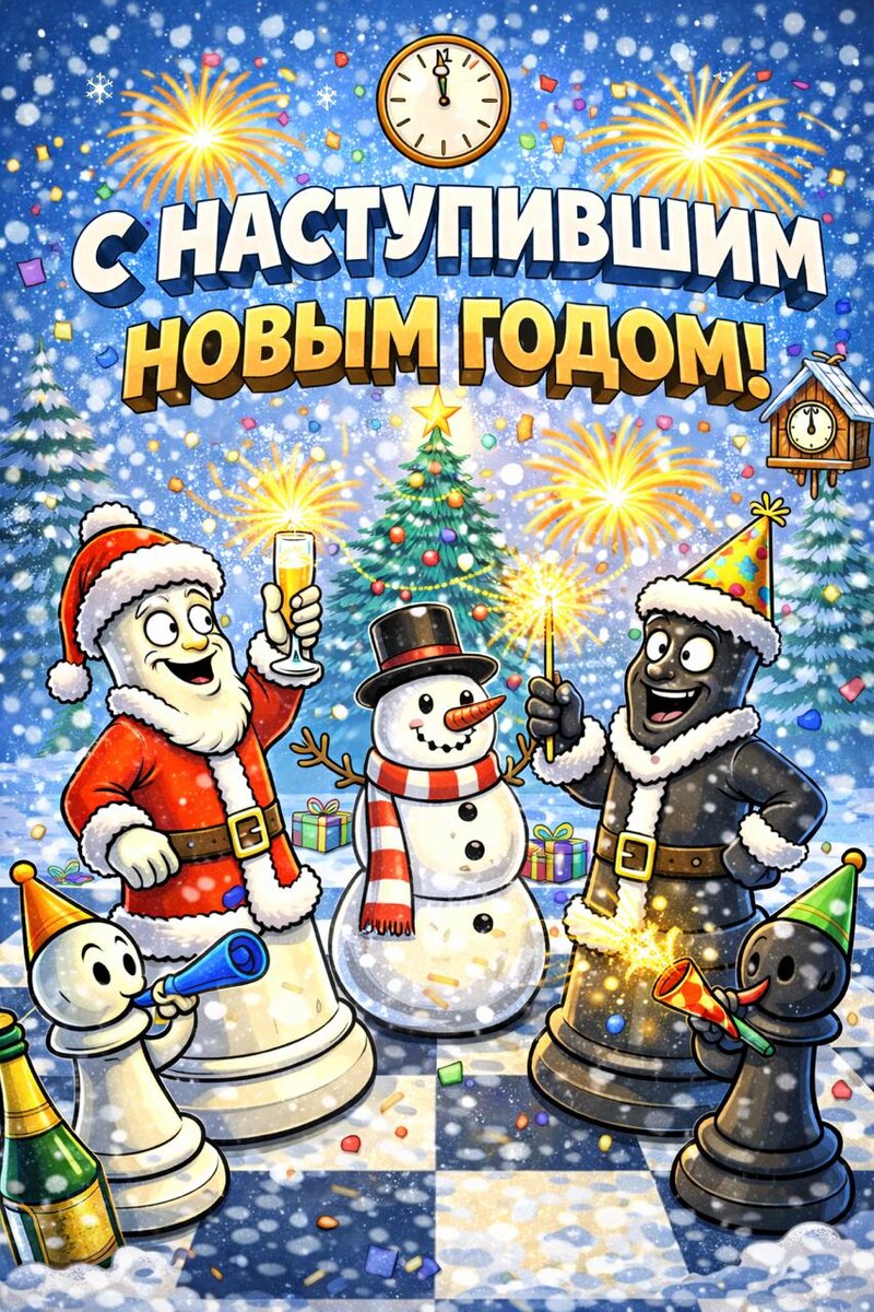 ! 🎄🥂 Пусть в 2026 году каждая ваша партия — будет как хорошо продуманный план: с крепким центром, надёжной защитой, неожиданными жертвами и красивым матом в финале. Пусть ошибки будут редкими, но поучительными, а каждый новый ход приближает вас к целям — и в шахматах, и в жизни. Играйте осознанно, учитесь, удивляйте и наслаждайтесь процессом! Сильных ходов, чистых комбинаций и много радости!