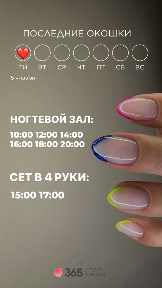 ! Желаем Вам в Новом Году новых ярких эмоций и впечатлений💯🔥. Пусть в доме царит мир уют и покой.🎄🎄🎁😊 Команда365 #красота #наслаждение #забота #зима #любовь #мечты сбываются #радость #возможности ЧТО МОЖНО УСПЕТЬ СДЕЛАТЬ 05 января 2026 года : Ногтевой зал: 10:00 12:00 14:00 16:00 18:00 20:00 Сет в 4 руки: 15:00 17:00 Парикмахерский зал: 10:00 14:00 16:00 18:00 Оформление бровей и ресниц: ближайшая дата для записи 13 января Косметология/шугаринг: ближайшая дата для записи 10 января ЗАПИСАТЬСЯ МОЖНО ЛЮБЫМ УДОБНЫМ СПОСОБОМ: 👉🏻 Сообщение в Whats'app https://wa.me/79663654477 👉🏻По телефону +79663654477 👉🏻Онлайн запись https://n286444.yclients.com/ #команда365 #красота #наслаждение #забота #зима #декабрь #любовь #мечтысбываются #радость #возможности