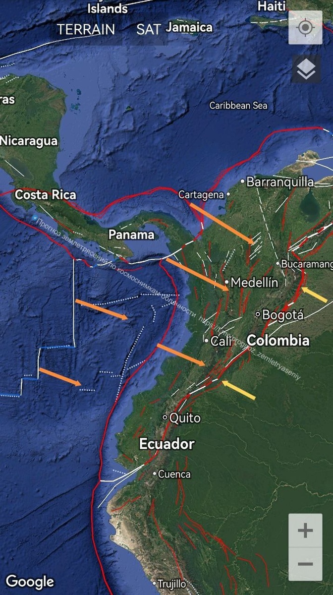 Есть вероятность землетрясения на севере Южной Америки и зоне ЦАМ М6.2-7.0 до 9 января. ===== Tectonic stress and degassing are observed on the southeastern rim of the Cocos Plate between Panama and Colombia. There is a possibility of an earthquake M6.2-7.0 before January 9th.