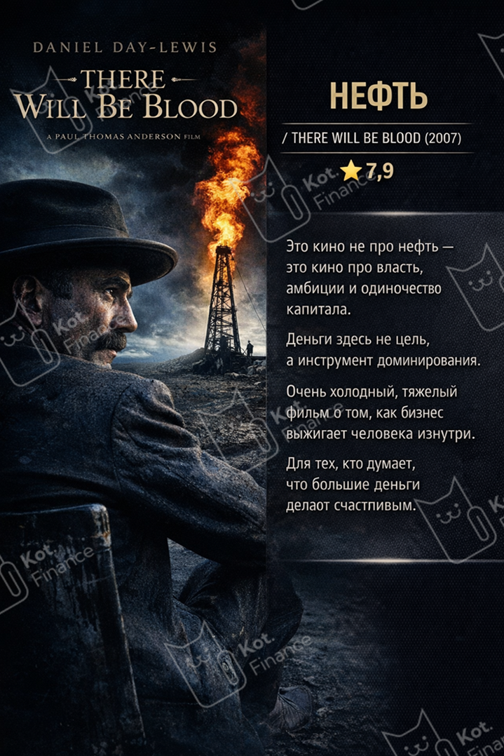 Длинные выходные дают возможность не только отметить праздники, доесть прошлогодний оливье и погулять по украшенному городу. Но и посмотреть любимые фильмы. Если хочется вернуться к ощущениям рынка – добро пожаловать в наш киноклуб. Сортировка по рейтингу Волк с Уолл Стрит / The Wolf of Wall Street (2013) ⭐️8,1 Фильм про деньги без тормозов, совести и риск-менеджмента. История о том, как жадность, харизма и отсутствие стопов могут зарабатывать миллионы - и так же быстро всё уничтожать. Отличный наглядный кейс, почему рост без контроля всегда заканчивается одинаково. Смотреть стоит не как инструкцию, а как предупреждение. Рекомендуем также почитать 👉 Слёзы рынка😭 Нефть / There Will Be Blood (2007) ⭐️7,9 Кино не про нефть - это кино про власть, амбиции и одиночество капитала. Деньги здесь не цель, а инструмент доминирования. Очень холодный, тяжелый фильм о том, как бизнес выжигает человека изнутри. Для тех, кто думает, что большие деньги делают счастливым Поменяться местами / Trading