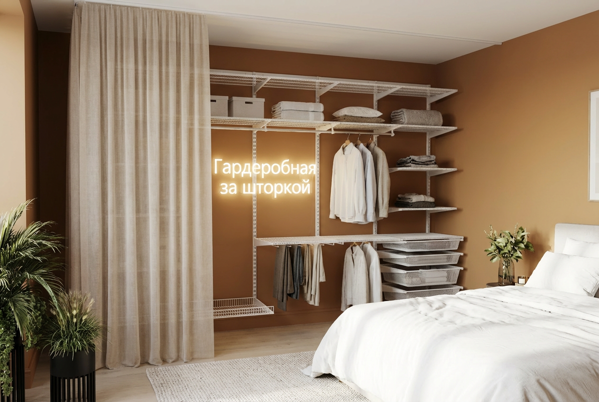 Гардеробная за шторкой решает сразу три задачи: хранение, порядок и отдельная зона без перепланировки.