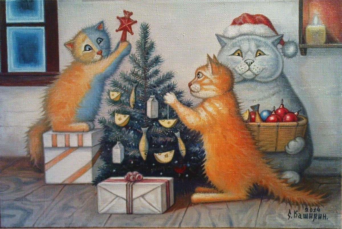 Много лет назад я написал картину, которая называется "Новый год". Соответственно актуальна она в любой новогодний праздник. Сейчас уместно её выложить, тем более картина совпала с процессом показа проекта «Люди-кошки».
