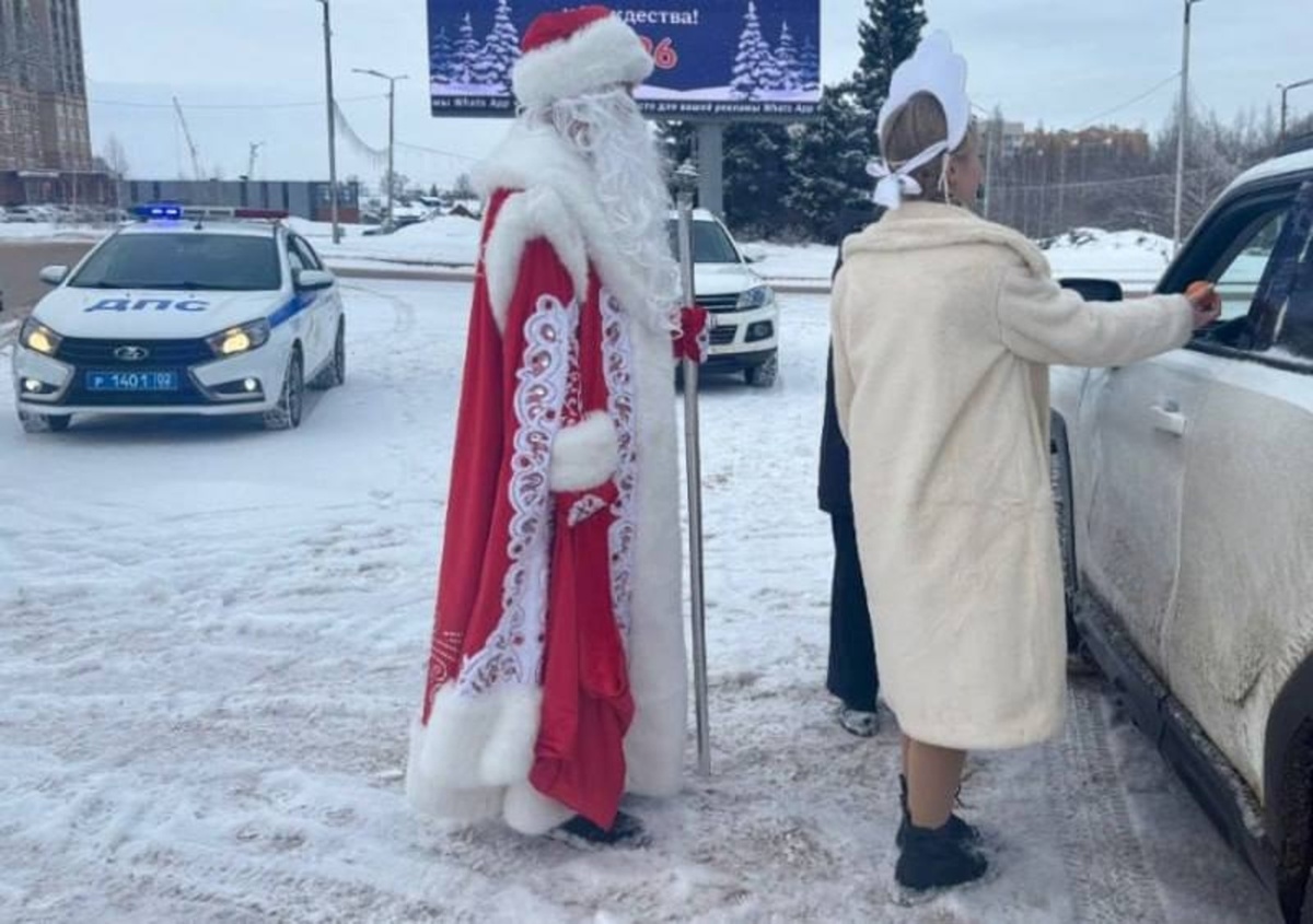 В преддверии Нового года на дорогах Октябрьского появился необычный патруль. Автомобилистов останавливали сказочные персонажи: полицейский Дед Мороз и Снегурочка. Зимние герои поздравляли водителей с наступающим праздником, дарили небольшие сувениры и напоминали о важности соблюдения правил дорожного движения. По словам руководителя республиканской Госавтоинспекции Владимира Севастьянова, данная акция проходила в рамках масштабной программы "Внимание – дети!" и социальной инициативы „Не губи ребенка, ПРИСТЕГНИ!“. Полицейский Дед Мороз не забыл и о юных пешеходах: им вручили светоотражающие браслеты и напомнили о правилах безопасного пересечения проезжей части. Фото: Госавтоинспекция РБ / ТГ-канал Владимира Севастьянова