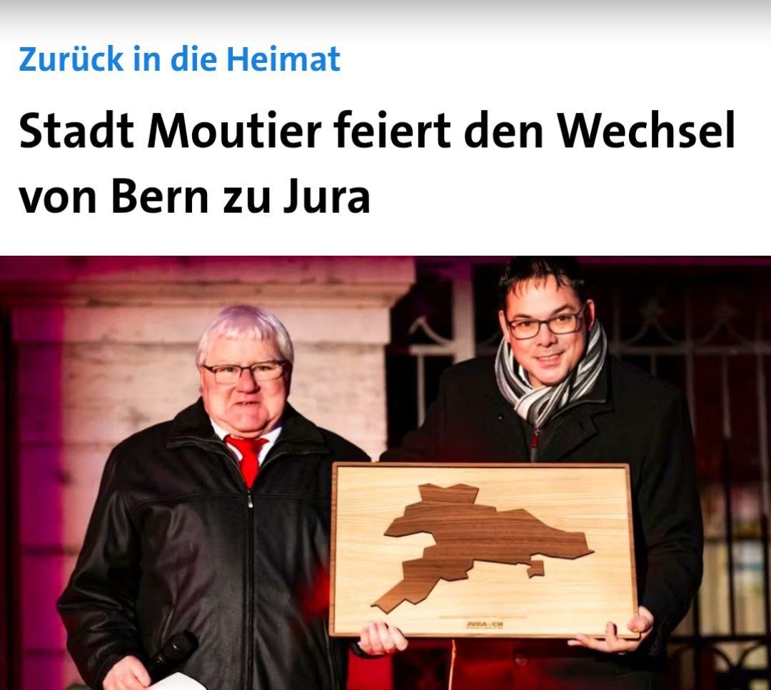 Город Мутье празднует переход из кантона Берн в кантон Юра Городской президент Марсель Винистёрфер подчеркнул на торжествах исторический характер этого перехода, который состоится ровно в полночь. В среду вечером в Мутье начались праздничные мероприятия, посвящённые переходу города из кантона Берн в кантон Юра. В официальной части торжества городской президент Марсель Винистёрфер отметил исторический характер трансфера, который произойдёт в полночь. «Спустя полвека после основания кантона Мутье теперь войдёт в состав кантона Юра. Так город вновь обретёт свою естественную родину», — сказал Винистёрфер перед примерно 300 собравшимися у здания городской администрации. Жителям Мутье выпала возможность пережить вместе с этой сменой кантона сильные и необычные эмоции, продолжил городской президент, выступающий за присоединение к Юре. История страны обогатится новой, эмоциональной и захватывающей главой. Федеральный советник Элизабет Бауме-Шнайдер, родом из кантона Юра, присутствовала на