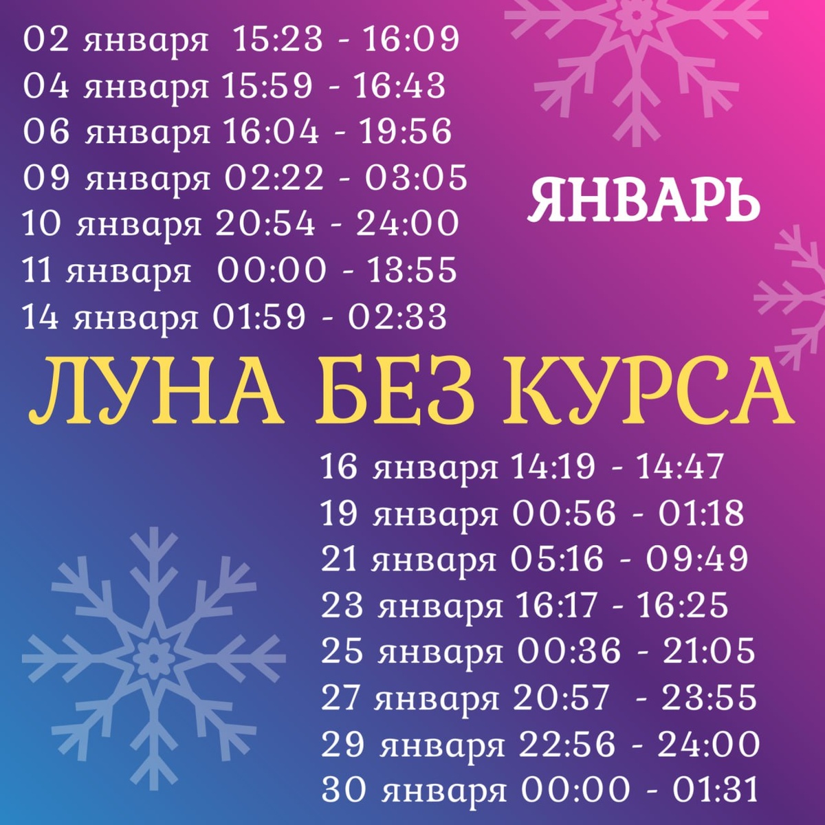 🌙 Новогодний привет всем! Символично отправляю вам в первый день Нового года график отдыха по Луне без курса. Хочу, чтобы в следующим году мы с вами не забывали, что отдыхать нужно и очень полезно. А если делать это в согласии с ритмами Космоса, то еще и негативных последствий для работы не будут. Маловероятно, что какие-то грандиозные и значимые события произойдут в периоды Луны без курса, а значит, вы точно ничего не пропустите. ВСЕМ Relax! #лунабезкурса #холостаялуна