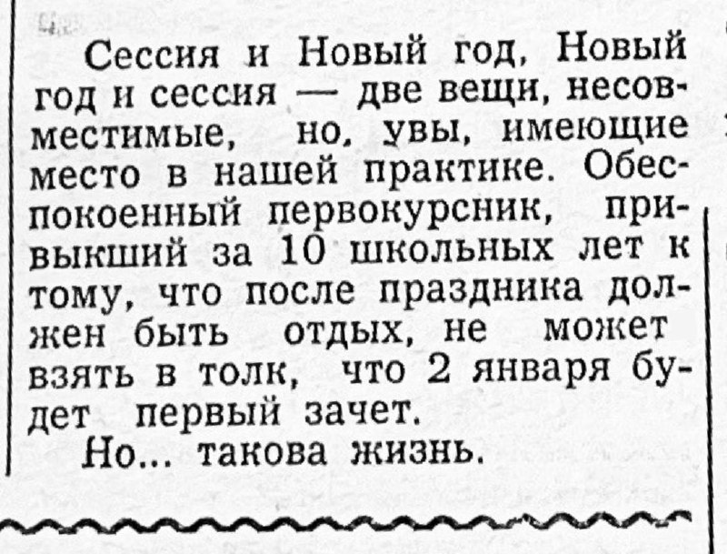 На картинке: публикация в инязовской газете «Советский студент», 1972 г. А теперь посмотрите на свой тазик прошлогоднего оливье и выдохните — до конца новогодних каникул ещё целых 10 дней 🕺