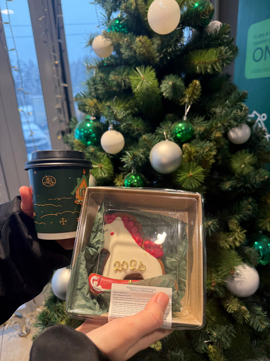 Под конец шоппинга решили зайти в Азбуку Вкуса, побаловать себя в новогоднюю ночь их десертами. Заодно купили там новогодний пряник подружке дочери с символом года и взяли кофе на обратную дорогу.