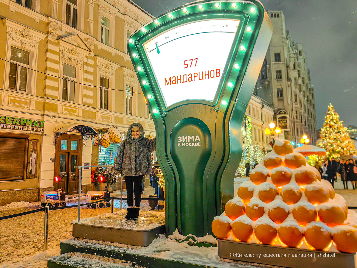 Очень необычные и даже немного философские весы установили на Старом Арбате. Там бесплатно предлагают взвеситься всем желающим и узнать свой вес в сочных мандаринах. Я узнал об этом случайно и отправился посмотреть своими глазами. Несмотря на поздний вечер, около удивительных весов выстроилась довольно большая очередь, как будто за мандаринами в советском гастрономе. Желающих узнать свой вес и сделать классную фотографию было предостаточно. Особенно радовались дети. Но солидные взрослые дяди и тёти не отставали и радовались не меньше детей. Я был не готов потратить несколько десятков минут, поэтому просто порадовался вместе с людьми и зарядился позитивом. Будь у меня побольше времени, тоже взвесился бы. Возможно, в другой раз. Мандарины — это не только самый популярный новогодний фрукт, но и тема оформления новогоднего Арбата. На улице поставили даже павильон в форме гигантского мандарина. Внутри небольшой магазинчик. Чуть ближе к метро «Смоленская» обнаружились еще одни весы, тоже