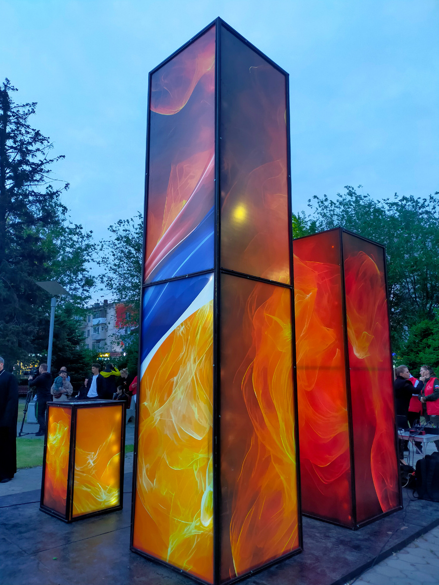 Это очень важное уточнение. Ведь остальные кубы не объемные и не прямоугольные. Я даже сфотографировал эту композицию, в которой перепутали порядок цветов русского флага. Сербам приятно. Потом кубы все-таки переставили в правильном порядке.