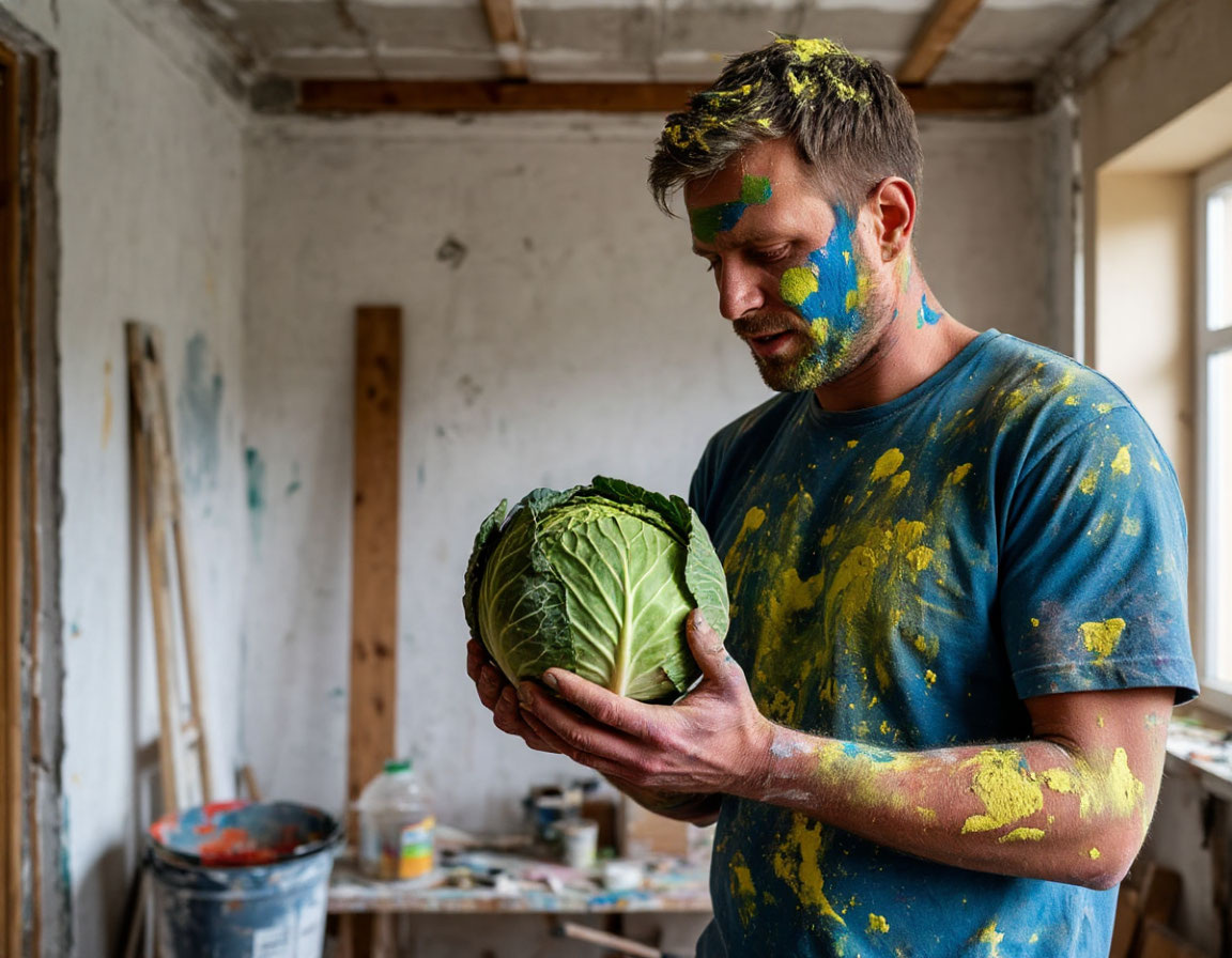 Я была ошеломлена. Это было… красиво. Безумно, но красиво. Он взял свёклу, разрезал её пополам, обмакнул срез в шпаклёвку, смешанную с алой акриловой краской, и начал ставить отпечатки вокруг капустного ядра. Получились яркие, сочные кляксы.