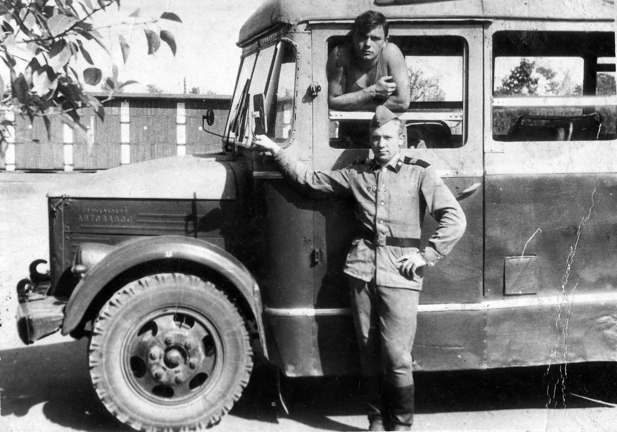 Старший сержант рядом со своим верным автобусом АП-4.