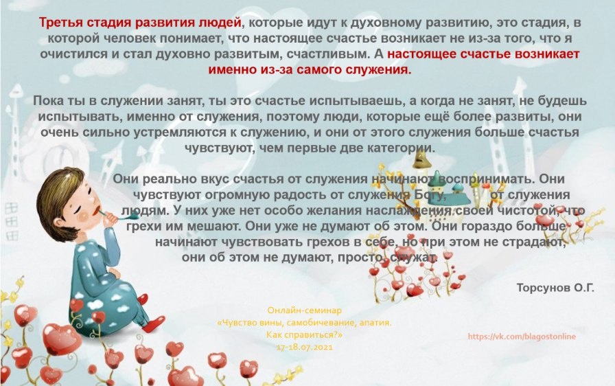 из-за того, что я очистился и стал духовно развитым, счастливым. А настоящее счастье возникает именно из-за самого служения. Пока ты в служении занят, ты это счастье испытываешь, а когда не занят, не будешь испытывать, именно от служения, поэтому люди, которые ещё более развиты, они очень сильно устремляются к служению, и они от этого служения больше счастья чувствуют, чем первые две категории. Они реально вкус счастья от служения начинают воспринимать. Они чувствуют огромную радость от служения Богу, от служения людям. У них уже нет особо желания наслаждения своей чистотой, что грехи им мешают. Они уже не думают об этом. Они гораздо больше начинают чувствовать грехов в себе, но при этом не страдают, они об этом не думают, просто, служат.