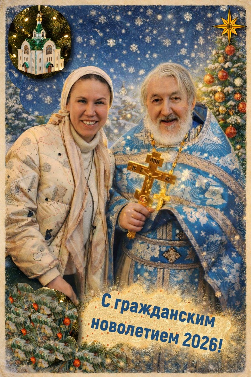 Дорогие мои, любимые читатели! От всего сердца поздравляю вас с гражданским новолетием, с 2026-м годом! Моя Маруся сделала для вас открытку с помощью нейросетей. Мы с отцом Александром Копяткевичем на фоне родного храма святителя Иова. В 2026-м году мы, с Божьей помощью, продолжим делиться с вами душеполезными проповедями. А я постараюсь придумать еще что-нибудь хорошее, покажу православную красоту, поделюсь с вами добрым и светлым. Радости вам , терпения. До нашего праздника, до Рождества Христова, осталось совсем чуть-чуть. Финишная прямая. Усилим пост и молитву. Обнимаю вас, мои дорогие. Благодарю вас за поддержку. Ваша Елена.