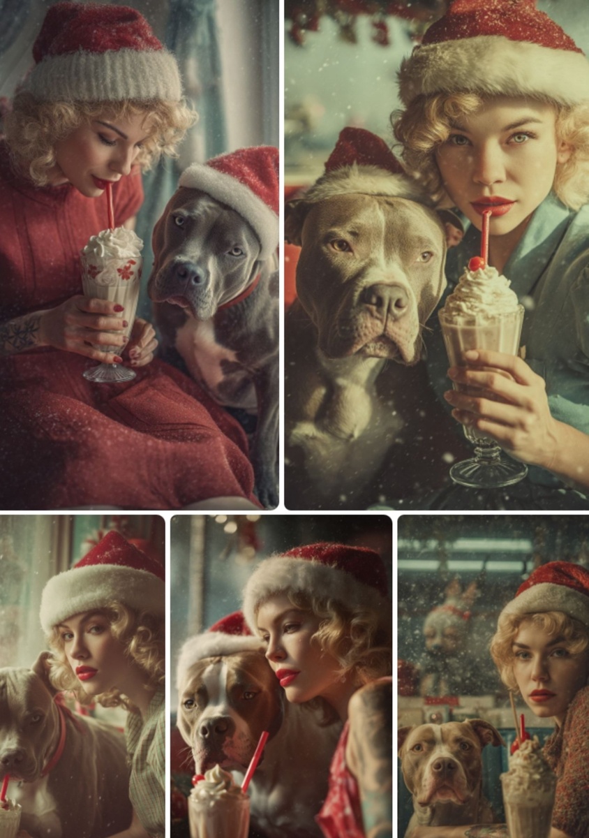 : hyper-realistic photograph of a young woman sitting next to a pit bull dog, both wearing Santa Claus hats, drinking a milkshake with whipped cream and a red straw, stylized in the vintage of the 1950s, the atmosphere of winter and Christmas, falling snow is visible outside the window, natural lighting with a soft warm glow, cinematic depth of field, detailed features faces, curly blonde hair from under a hat, a subtle floral noticeable tattoo on the wrist, textured skin, realistic textures of fabric and skin, warm tones with festive Christmas decorations in the cozy interior of a retro cafe, the atmosphere of an English pub, high resolution, highly detailed, subtle film grain --v 7 --q 2 --ar 3:4 #артпромпт@bestpromptai