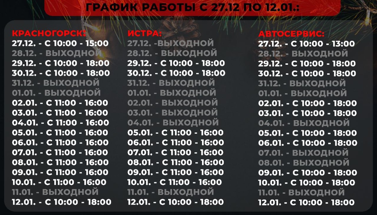 ! 🤩LOFT TAXI шлет вам самые искренние новогодние поздравления☃️! Пусть 2026 год принесёт удачу на дорогах и процветания в делах. 📣Спешим сообщить, что уже завтра мы вновь готовы распахнуть свои двери: 📍Наш офис в г. Красногорск (ул. Школьная, д. 6Б) ждёт вас с 11:00 до 16:00. 📍Автосервис в Дедовске (ул. Лермонтова, д. 1) будет открыт с 10:00 до 18:00, чтобы ваш автомобиль был всегда в идеальном состоянии. 💵Хотите приятный бонус? Приглашайте друзей в LOFT TAXI на аренду автомобилей классов КОМФОРТ и КОМФОРТ+, и за каждого нового водителя вы получите щедрый подарок — 15 000 ₽🎁. ========================= Станьте частью LOFT TAXI прямо сейчас: 📞 +7(916)277-99-79 🌐 Сайт аренды 💬 Чат LOFT TAXI 🚕 Яндекс Гараж Чтобы всегда быть в курсе самых свежих новостей и выгодных предложений, подписывайтесь на наши страницы⬇️: 📱 Вконтакте 📱 Дзен-канал 📱 Instagram 📱 YouTube И помните, мы всегда рады видеть вас в нашем уютном офисе по адресу❤️: 📍 г. Красногорск, ул. Школьная, дом 6Б, -