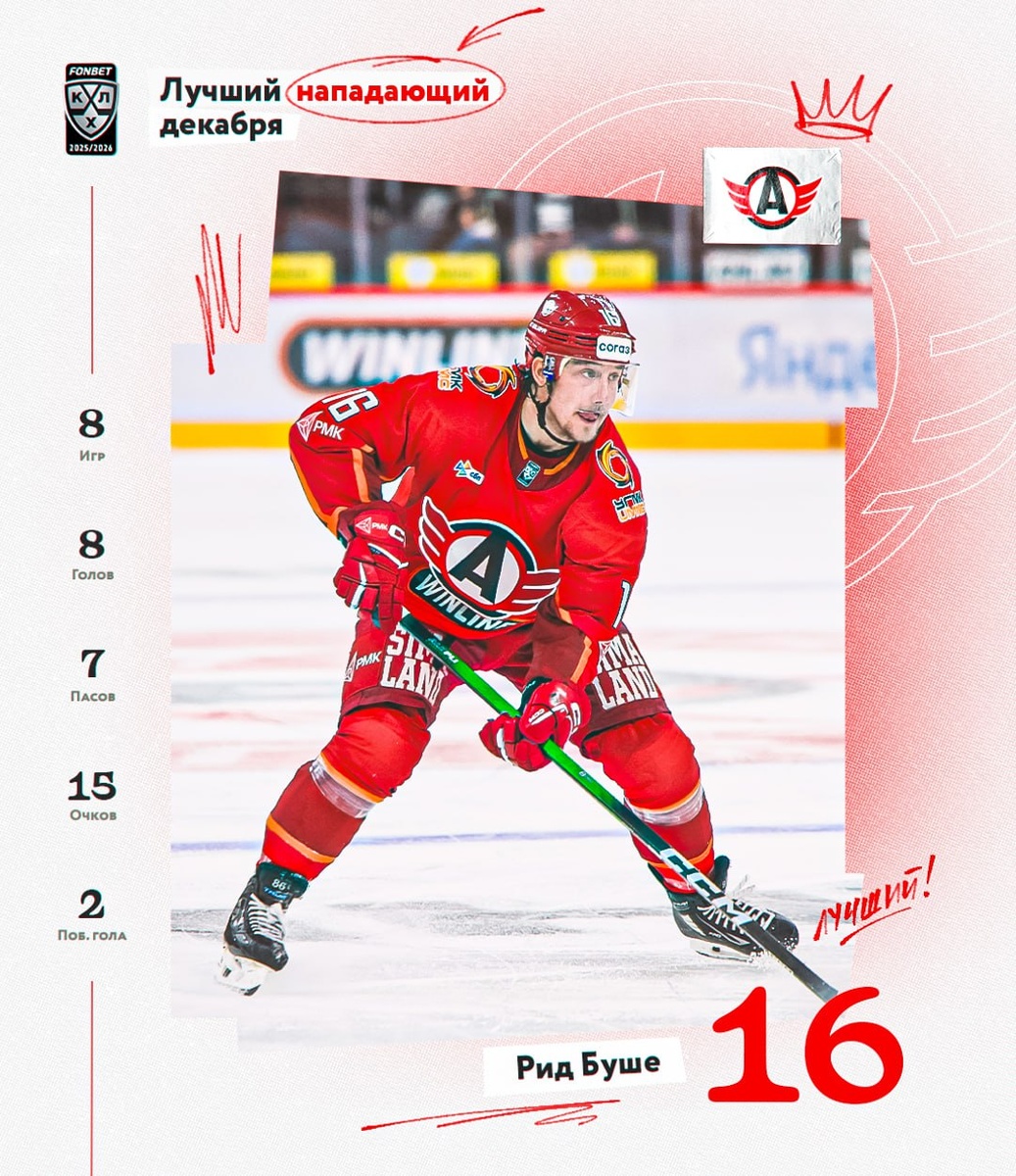 🚗 Рид Буше забил 8 голов и набрал 15 очков в 8 матчах декабря и во второй раз в карьере признан лучшим нападающим месяца в КХЛ!
