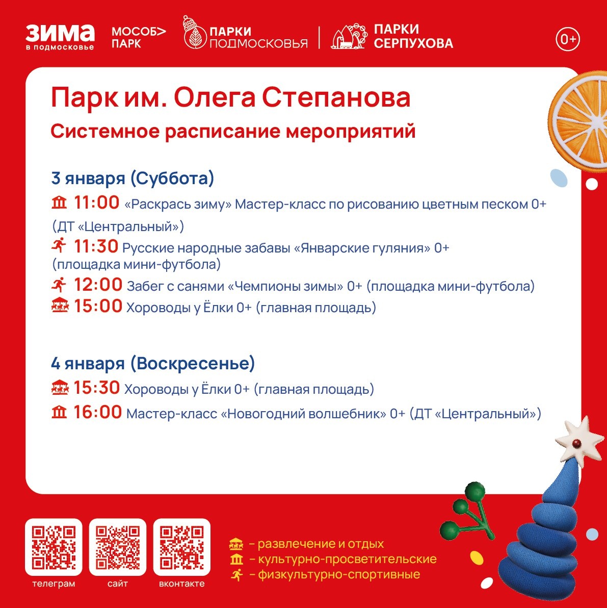 ✨ Расписание в парке им О. Степанова до 04.01.26 👉Ждём Вас третьего и четвёртого января 2026 года. 🎄❄️Вас ждут мастер-классы, русские забавы, хороводы, забеги и многое другое 🚫 Возраст: 0+ 🏢 Парк им.Олега Степанова 📍 г. Серпухов, ул. Луначарского, д.74 💰 Вход свободный❗️ ⭐Поддержать канал голосом 💰 Канал Вакансии Серпухова ✅ Мероприятия Серпухов https://dzen.ru/id/66f01c6eb4c6fe60c9ca1608 http://vk.com/serpukhov_events http://dzen.ru/serpukhov_events