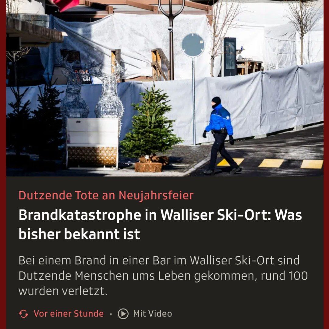 Пожар на горнолыжном курорте в кантоне Вале: что известно на данный момент При пожаре в баре на горнолыжном курорте Кран-Монтана (кантон Вале) погибли несколько десятков человек. Около 100 человек получили ранения. Что известно и что пока остаётся неясным. Что произошло: В новогоднюю ночь в баре «Le Constellation» на горнолыжном курорте Кран-Монтана произошёл пожар, в результате которого погибли несколько десятков человек. Около ста человек получили ранения, большинство из них — тяжёлые. Пожар вспыхнул около 1:30 ночи. Что известно о погибших: Власти на пресс-конференции отвечали на вопросы журналистов очень сдержанно и не стали раскрывать подробности о числе и личности погибших. На месте работают судебные медики, занимающиеся идентификацией жертв. По данным прокуратуры, установление личности погибших является первоочередной задачей. Поскольку курорт пользуется популярностью у иностранных туристов, предполагается, что жертвы являются гражданами разных стран. Судебно-медицинские п