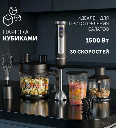 Вы когда-нибудь задумывались, сколько времени и нервов уходит на одно простое блюдо? Представьте: нужно нарезать лук кубиками, натереть сыр, взбить суп-пюре и приготовить соус. И вот вы уже моете нож, тёрку, блендер, миксер... А вечер, который мог быть отдыхом, превратился в мучение у мойки. Что, если все эти манипуляции может сделать один прибор? Причём быстрее, аккуратнее и почти без вашего участия. Знакомьтесь: погружной блендер Polaris PHB 1589AL CUBE. Это не просто «палочка», чтобы суп взбить. Это — ваша законная хитрость для победы над кухонным хаосом. Его секрет — в комплектации, которая заменяет целый шкаф с утварью. В красивой черно-серебристой коробке вы найдёте не просто моторную ручку. Вы получите целый арсенал: CUBE — значит «куб». И это идеальная метафора. Он превращает гору разномастных овощей в ровные, готовые к приготовлению кубики за один оборот ножа. А ещё он — фундамент для вашей новой, быстрой и красивой кухни. Почему вы уже сейчас представляете его у себя на с
