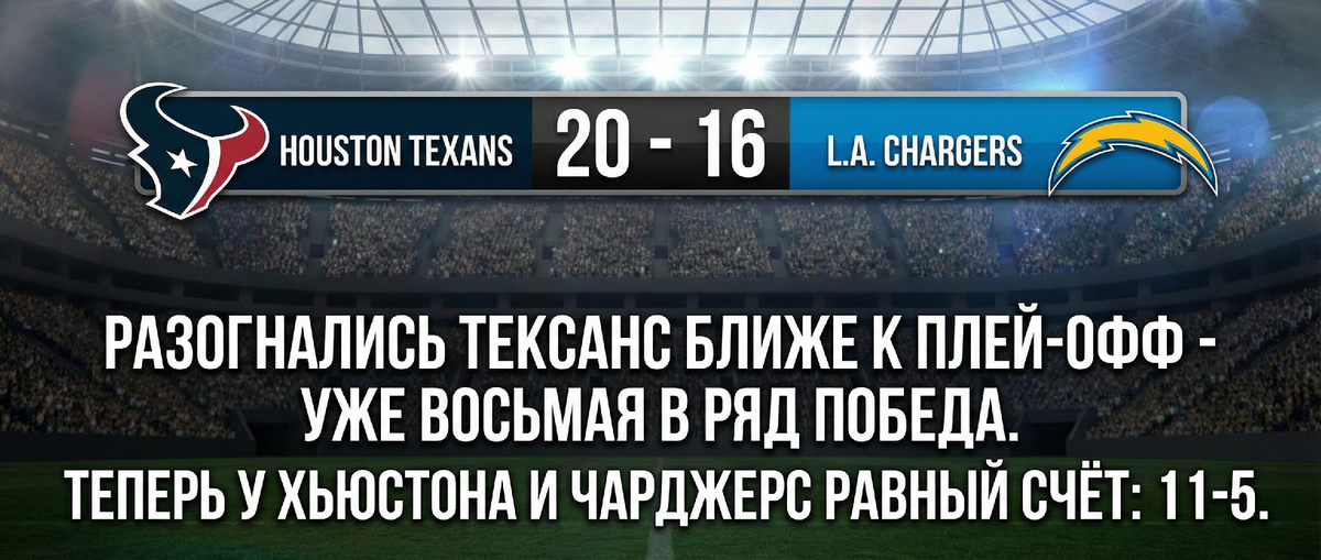 Теперь повержены Чарджерс 20:16 и у Хьюстона теперь равный с "батарейками" счёт побед и поражений - 11-5.