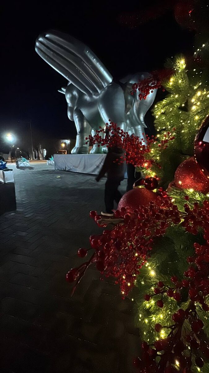 Прогулялись и на Фестивальную площадь. Там кроме елок появилась надувная фигура аликорна – мифического существа, которое сочетает в себе черты пегаса и единорога. Её предоставил городу санаторий «Планета» для того, чтобы порадовать жителей и гостей Евпатории. Санаторий «Планета»- это там где мы периодически устраиваем себе некоторые мероприятия.