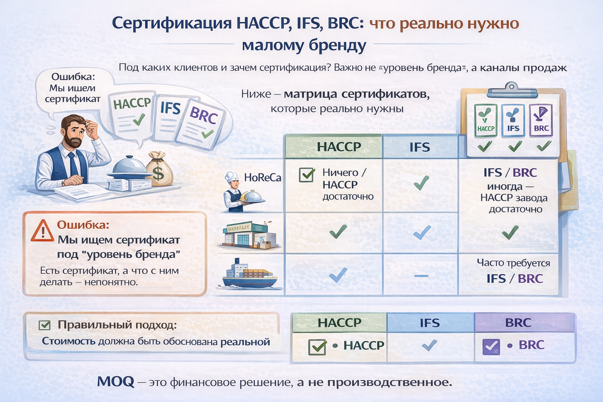 IFS/BRC нужны не всегда — часто достаточно сертифицированного завода и декларации соответствия. ( в зависимости от вида продукта). Экспорт.