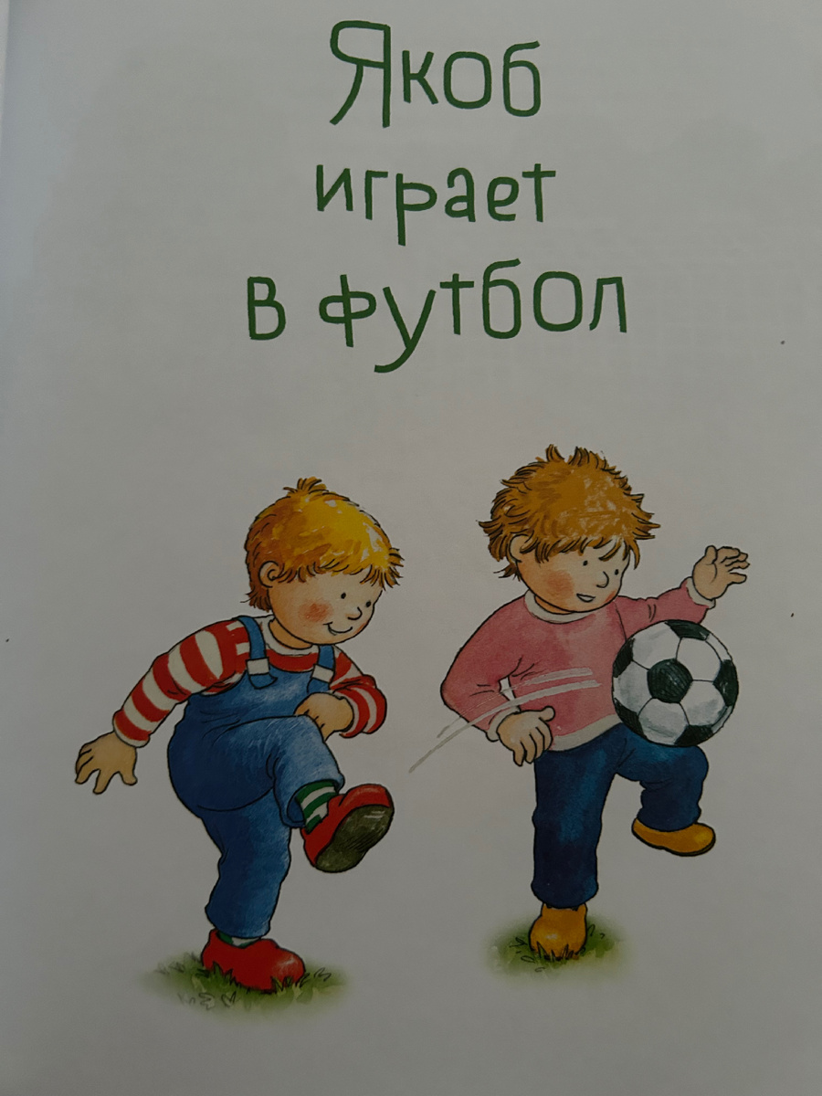 Якоб тупты ҡыҫып тотҡан килеш юлға ҡарай. Уларҙың юлы ысын футбол майҙаны янынан үтә. Футболсыларҙың бер-береһенә матур итеп тупты тибеүен ҡарап тороу күңелле! Якоб уларға ҡулын болғай, һәм ҡапҡа һаҡсыһы ла яуап итеп болғап ебәрә!