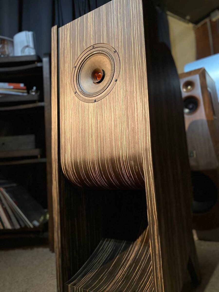 ! По обзорам из журналов и некоторым видео мы узнали об интересной рупорной акустике немецкой компании Voxativ. Ее создатель кроме увлечения конструкцией рупоров Lowther с 19 лет, является специалистом по газодинамике. Его имя официально упомянуто в действующем патенте на дизельные двигатели Mercedes-Benz. Поскольку на тот момент у нас был уже опыт моделирования акустических оформлений, мы решили промоделировать Voxativ Ampegio и разобраться для себя, как оно работает. На самом деле это очень интересное акустическое оформление, которое сочетает в себе достоинства обратного рупора и лабиринта, обеспечивая чистое звучание рупора без “неблагозвучных” рупорных гармоник. Поскольку использовать динамики производства Voxativ для экспериментов было довольно дорого, мы решили применить полученные в результате “реверс-инжиниринга” знания для создания акустической системы на популярном в мире широкополосном высокочувствительном динамике (чувствительность 96.5 дБ), который выбрали из нескольк