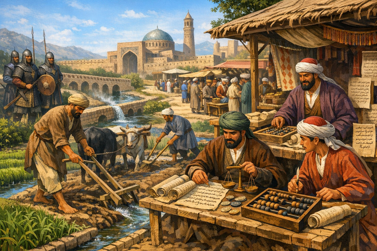бароны, замки, крестьяне страдают, всё плохо. А теперь переносимся в IX–X века, в государство Саманидов — и внезапно выясняется, что феодализм бывает восточный, умный и вполне себе рабочий. Без рыцарей в латах, зато с ирригацией, рынками и налоговыми ведомостями. ------------------------ Хотите выучить таджикский язык подписывайтесь ко мне в телеграм канал: @tajikistanlanguage ------------------------ Экономика Саманидов держалась не на золоте и не на завоеваниях, а на земле и воде. Земля без воды в Мавераннахре — это просто очень пыльный ковёр.