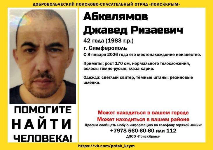 Добровольческий поисково-спасательный отряд «ПоискКрым» разыскивает жителя Симферополя Джаведа Абкелямова, местонахождение которого неизвестно с 8 января 2026 года. Мужчина 1983 года рождения, ему 42 года. Приметы: рост около 170 см, нормального телосложения, тёмно-русые волосы, карие глаза. На момент исчезновения был одет в светлый свитер, тёмные штаны и резиновые шлёпки. ЧИТАЙТЕ ТАКЖЕ: В Крыму после празднования Нового года пропала 17-летняя девушка «Просим сообщать любую информацию, — обращаются волонтёры. — Он может находиться в вашем городе или районе». Все данные, которые могут помочь в поисках, просьба передавать на горячую линию отряда по телефону +7 978 560-60-60 или по номеру 112. Читайте новости Крыма первыми в нашем Telegram-канале и даже когда не работает мобильный интернет в национальном мессенджере MAX.