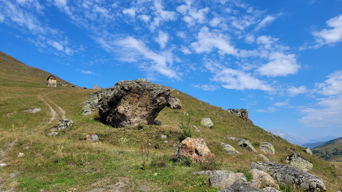 Следующая точка Цимити (Цмити). Горное селение Цимити в наши дни — археологический комплекс, музей средневековой истории под открытым небом. Здесь более 30 памятников архитектуры — башни, руины жилых домов, склепы. И все это на фоне величественных гор. Дорога к селению простая. Легкий серпантин и въезжаешь на небольшую парковку. Место не раскручено. Людей нет. Некоторые башни реставрируются, часть построек разрушена. Пробираемся по тропинкам, стараясь обходить коров, которые тут чувствуют себя как дома и минируют все дорожки и узкие тропинки. Часть башен закрыто. И рассматривать можно только снаружи. К склепам не пошли, так гуляли с Рексом. Да и сказывалась уже усталость. Утром мы уже сходили на Мидаграбинские водопады. День какой-то длинный получился. Чувствовалось, что скоро вечер, хотелось найти место стоянки и просто спокойно поужинать. Я планировала стать на ночевку выше Цмити, но как-то не захотелось в тот момент. Нашли небольшую площадку, огороженную стеной. Там стояли длинные столы и скамейки. Ветра тут не было. Просто сидели и решали куда ехать дальше. Вернее, где ночевать. С этого места открывался шикарный вид на долину. И прикидывали где можно стать на другой стороне реки. Решили искать просто по дороге: понравилось – остановились.