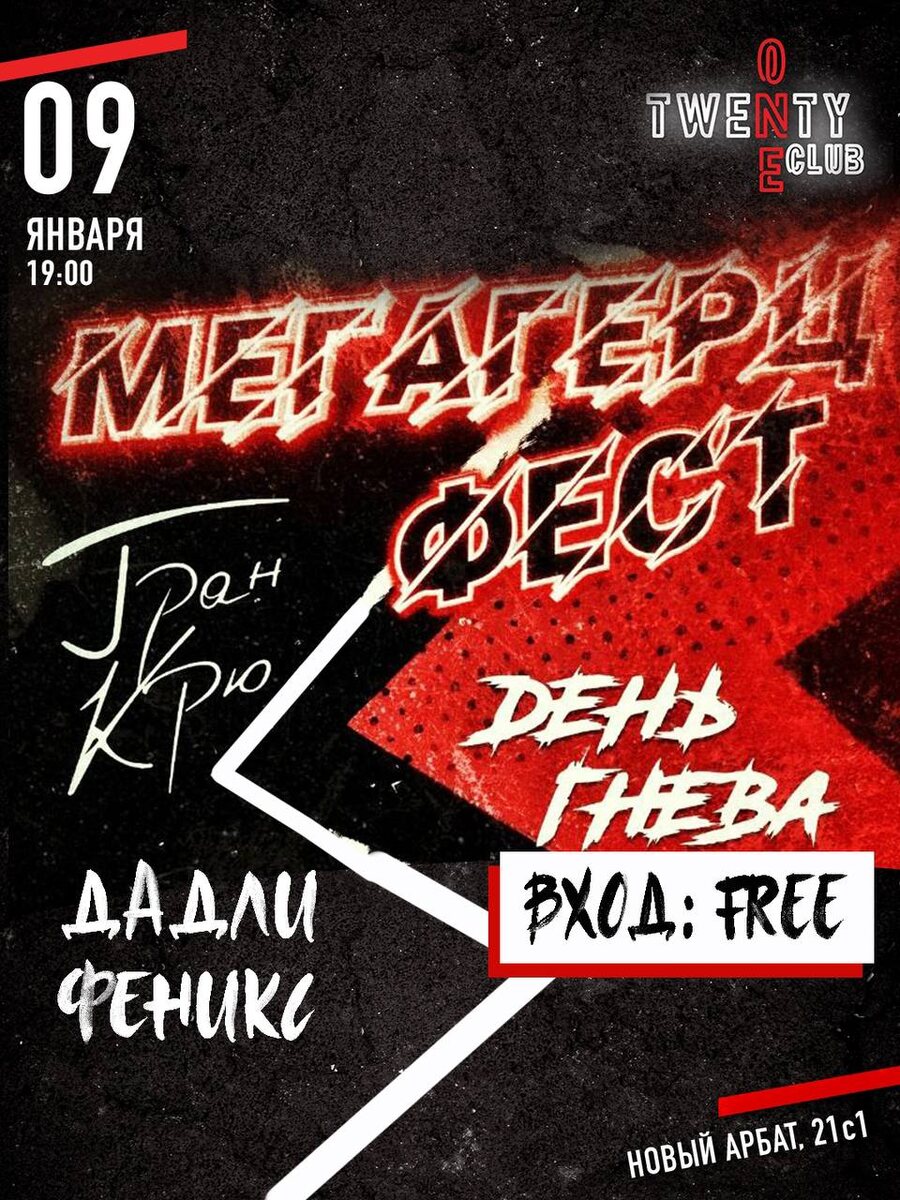 ! Несколько часов огненной музыки - это то, что надо! Участие примут: ГРАН КРЮ - кинематографичный рок-н-ролл с литературным отзвуком и экспрессивным вокалом. Сами про своё творчество они говорят, что это "Авантюра дерзких интровертов и вдумчивых экстравертов, основанная на реальных событиях." Антон Сабаев - блюзовый музыкант, гитарист импровизатор, сочинитель мелодичных песен, выступающий под творческим псевдонимом "ДадлиФеникс". За двадцать с лишним лет сочинил порядка двухсот песен. Участвует в различных проектах, сотрудничает с множеством музыкантов. В 2017 году выступил с Сергеем "ЧиЖ" Чиграковым на Рок-фестивале "НАШЕСТВИЕ", как лучший гитарист. ДЕНЬ ГНЕВА - это группа исполняет настоящий олд-скульный металл в лучших традициях! Мощно и здорово! Недавно у музыкантов вышел сингл "Небо в огне", и мы уверенны, что эта песня прозвучит на фестивале "Мегагерц" Встречаемся в клубе Twenty One Club ул.Новый Арбат, 21с1 Начало в 19:00 Вход СВОБОДНЫЙ