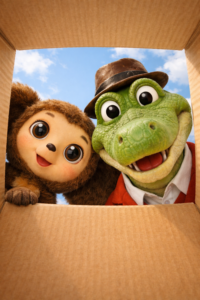 Extreme close-up POV shot, looking up through a square cardboard opening against a blue sky. [Чебурашка и Крокодил Гена] are peeking over the edge, looking down directly into the lens. Their faces are huge and fill most of the frame.