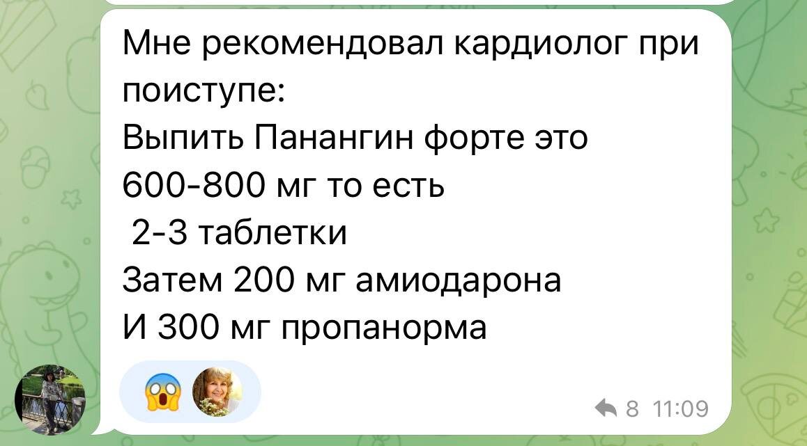 1️⃣ Панангин. Панангин (калий+магний) часто дают как “подстраховку”, если есть лабораторно подтвержденный дефицит K/Mg, поскольку гипокалиемия/гипомагниемия действительно повышают аритмогенность. Но: 📍это не препарат для купирования ФП как таковой, он не останавливает фибрилляцию. 📍эффект на ритм, если и есть, косвенный и небыстрый (особенно при пероральном приеме) 📍при таком приеме есть риск: если у человека снижена функция почек или он принимает препараты, повышающие калий (иАПФ/БРА, спиронолактон/эплеренон/Юперио), то можно получить гиперкалиемию, которая сама по себе опасна развитием еще более опасных аритмий Вывод: Панангин как дополнительный препарат при подтверждённом дефиците в дополнении к терапии - ок, как обязательный этап купирования приступа - спорно 2️⃣ Амиодарон 200мг перорально. Амиодарон - мощный антиаритмик (класс III), но: 📍пероральные 200мг не является быстрым купирующим вариантом для острого пароксизма (в отличие от внутривенного варианта введения) 📍станда