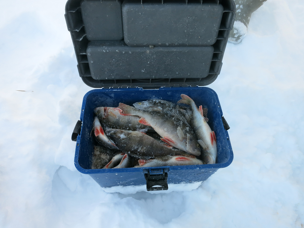 Один нашёл уловистую лунку на мормышку и надрал пакет разнокалиберного окуня. Другой нашёл две лунки, на одной набил пакет на мормышку, на другой после обрыва, на балансир(2,0см.)набил за полчаса ящик отборным окунем (400-500гр.) Я "срисовал" информацию, и завтра мог бы наловить два ящика окуня, но... он мне не особо то и нужен. Понимание есть, где, когда и на что ловить. А что ещё и нужно то? Пассивный окунь, весь в пиявках, которого мы ловили, стоит в канавинах ближе к берегу, активный окунь перемещается по канавинам ближе к бровке реки Молога. Они тупо бегают по плесу и сверлят, сверлят.