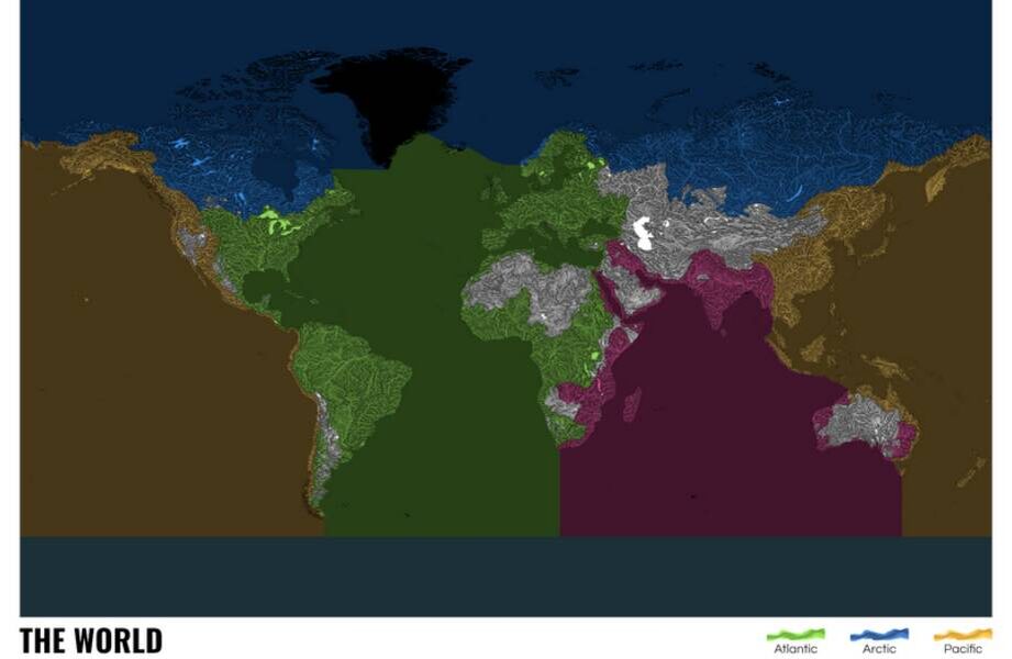 Карта движения всей воды на Земле. До недавнего времени не существовало единой визуализации, которая объединила бы все речные системы планеты и проследила их путь к океанским водам. Этот пробел восполнил проект Grasshopper Geography, автор которого ― географ и специалист по геоинформационным системам. Карты проекта ― не просто научные схемы, они давно стали художественными произведениями. На карте черным или синим обозначен океан, а яркие цвета обозначают реки. В итоге сложная гидрологическая информация становится понятной даже ребенку. Карта использует цветовое кодирование, позволяющее мгновенно определить, к какому океаническому бассейну относится тот или иной водоток. Взглянув на такую карту, можно мгновенно понять, что практически все крупные реки России несут свои воды в Северный Ледовитый океан. Что касается самой карты Евразии, то она впечатляет разнообразием ― от сибирских рек к Арктике до индийских потоков в Индийский океан. Работы проекта получили признание в медийном простра