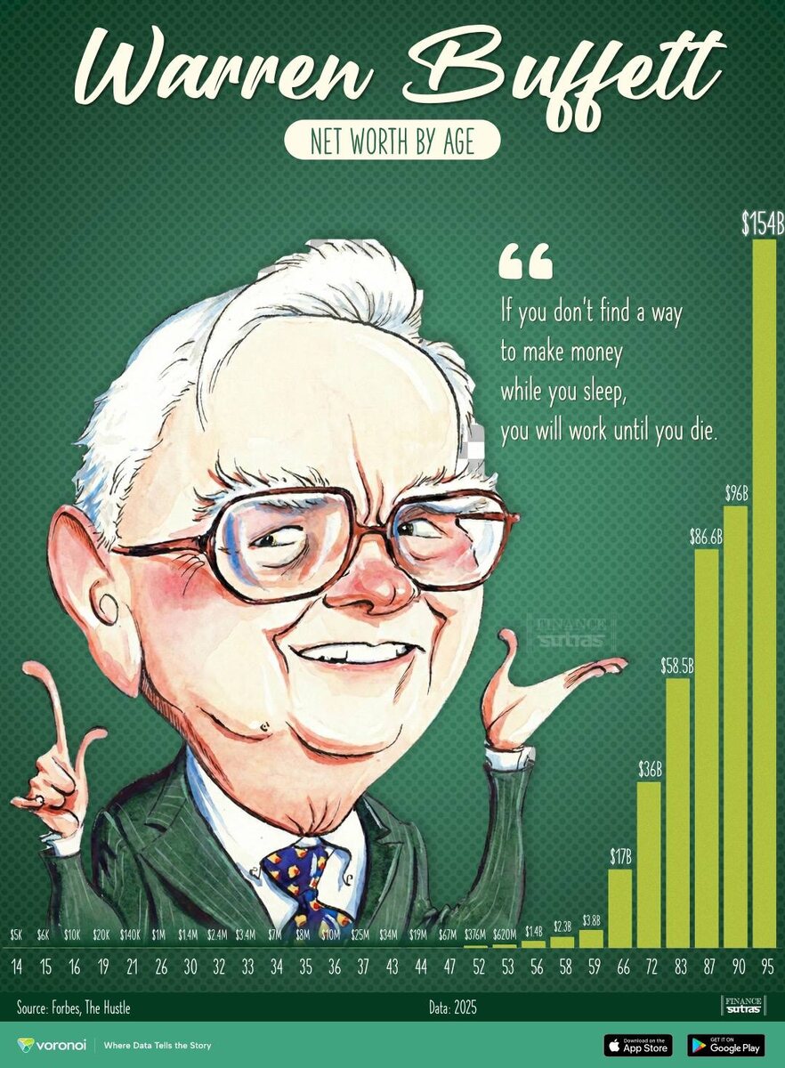 ) На картинке главный смысл простой: большая часть состояния Баффетта выросла уже после 60. Не потому что он нашёл “секретную кнопку”, а потому что деньги любят время. И когда капитал уже большой, рост становится заметным. Но, конечно, есть нюанс. До 60 он не был “обычным парнем”. Он уже был очень богатым, просто не на уровне “сотни миллиардов”. Плюс такие графики - это примерная оценка, а не выписка по счету. Плюс есть еще один интересный момент. История “просто держи и жди” работает, если по дороге не прилетит чёрный лебедь: одна крупная ошибка, слишком высокий риск, ставка “все деньги в одну компанию”. И долгий путь может закончиться раньше, чем начнётся магия сложного процента. Какой вывод делаем? Баффетт - это не про “гениальные сделки каждый день”, а про терпение и умение не делать глупостей. Иногда лучший ход - просто не мешать своим деньгам расти. И, конечно, удача не помешает. Без нее мы могли не увидеть того Баффета, которого знаем сейчас. Telegram | YouTube | Все гайды