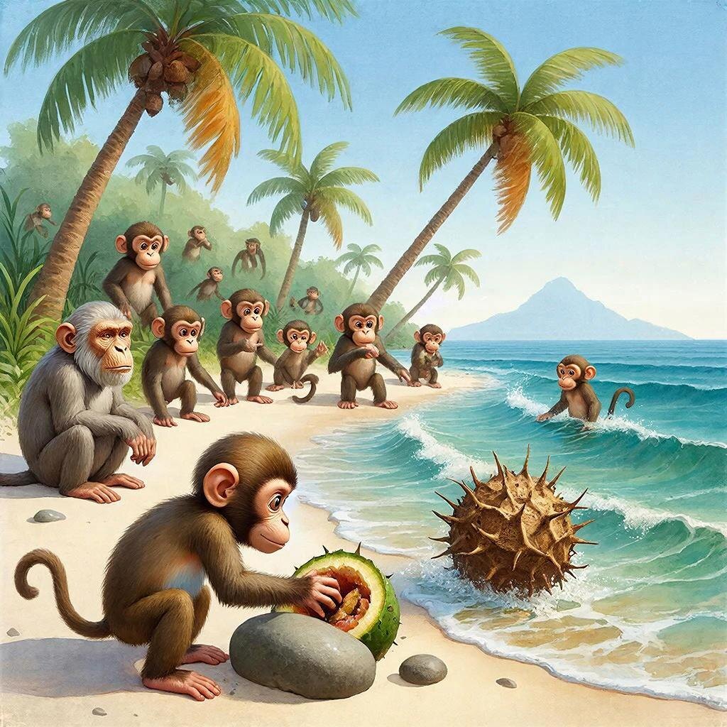 На далеком-далеком острове, где-то посреди океана, где пальмы шелестели листьями на знойном солнце, жило большое племя обезьян. Жили они так же, как всегда жили их предки: ели то, что падало с деревьев, пили из ручья и боялись одного – холодного моря. Море у их берегов было прекрасным, ласково-синим, но в его пенных гребнях лежали странные плоды, похожие на колючие шары. Они были твердыми, холодными на ощупь и совершенно несъедобными. Каждого, кто пытался их укусить, ждали лишь горечь и боль. «Так было всегда, – говорили старейшины. – Море дает рыбу, а эти плоды – обман, они не для нас». И все обезьяны обходили их стороной, а детенышей даже шлепали по лапкам, если те тянулись к колючей диковине. Но однажды одна маленькая обезьянка, самая любопытная и голодная после шторма, подошла к воде. Она долго смотрела на холодный плод, качавшийся на волне. Ей было страшно, но в животе сосало от голода. И вдруг, сама не понимая почему, она подняла камень и ударила им по колючкам. Плод треснул с т
