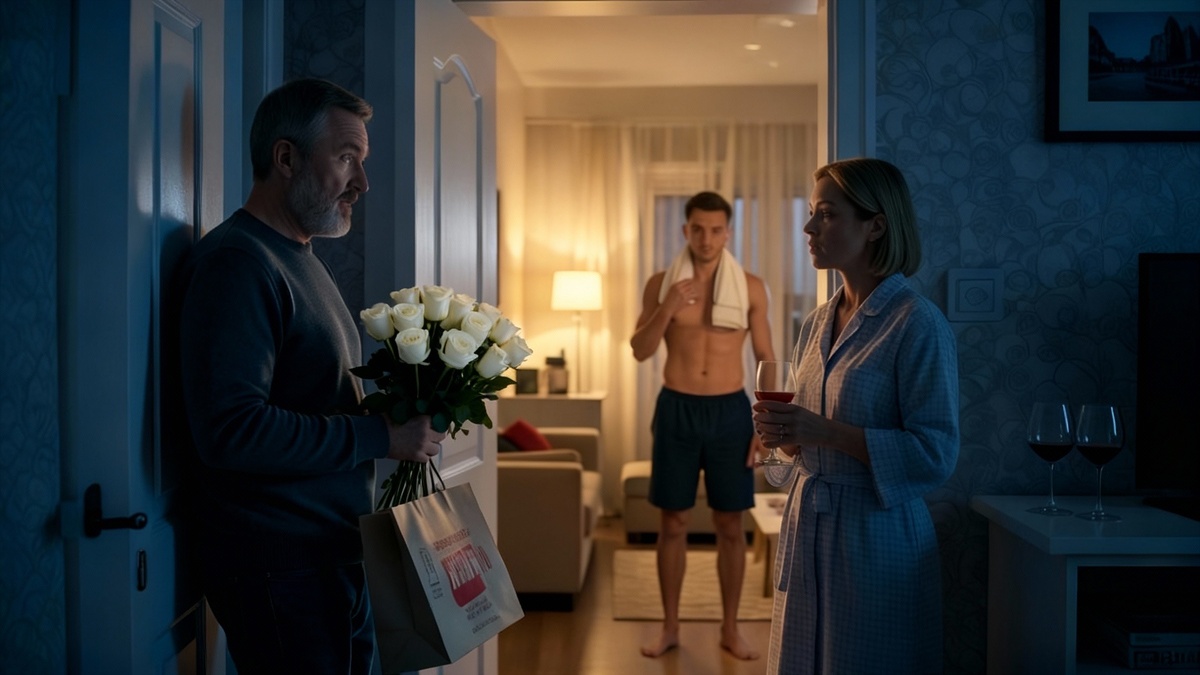 Я замерла в проёме ванной, затягивая пояс халата. Звук его ключа в замке прозвучал как выстрел. Он стоял в прихожей, в руках – дурацкие белые розы и пакет из «Азбуки Вкуса». Его взгляд скользнул по мне, провалился вглубь квартиры, на кухню, где на столе стояли два бокала, и задержался на Артёме. Тот вышел из гостиной, босиком, в одних спортивных штанах, вытирая шею полотенцем.