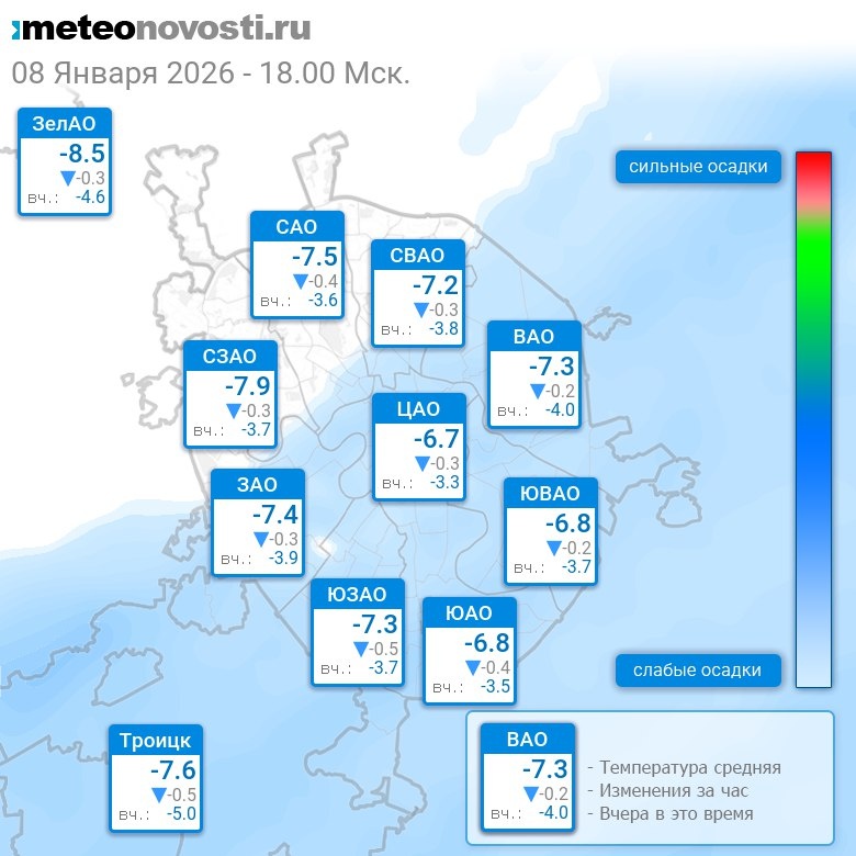 В 18:00 в Москве было от -8.9°C до -5.8°C, средняя температура -7.2°C #погода #Москва #зима #температура #8января #четверг