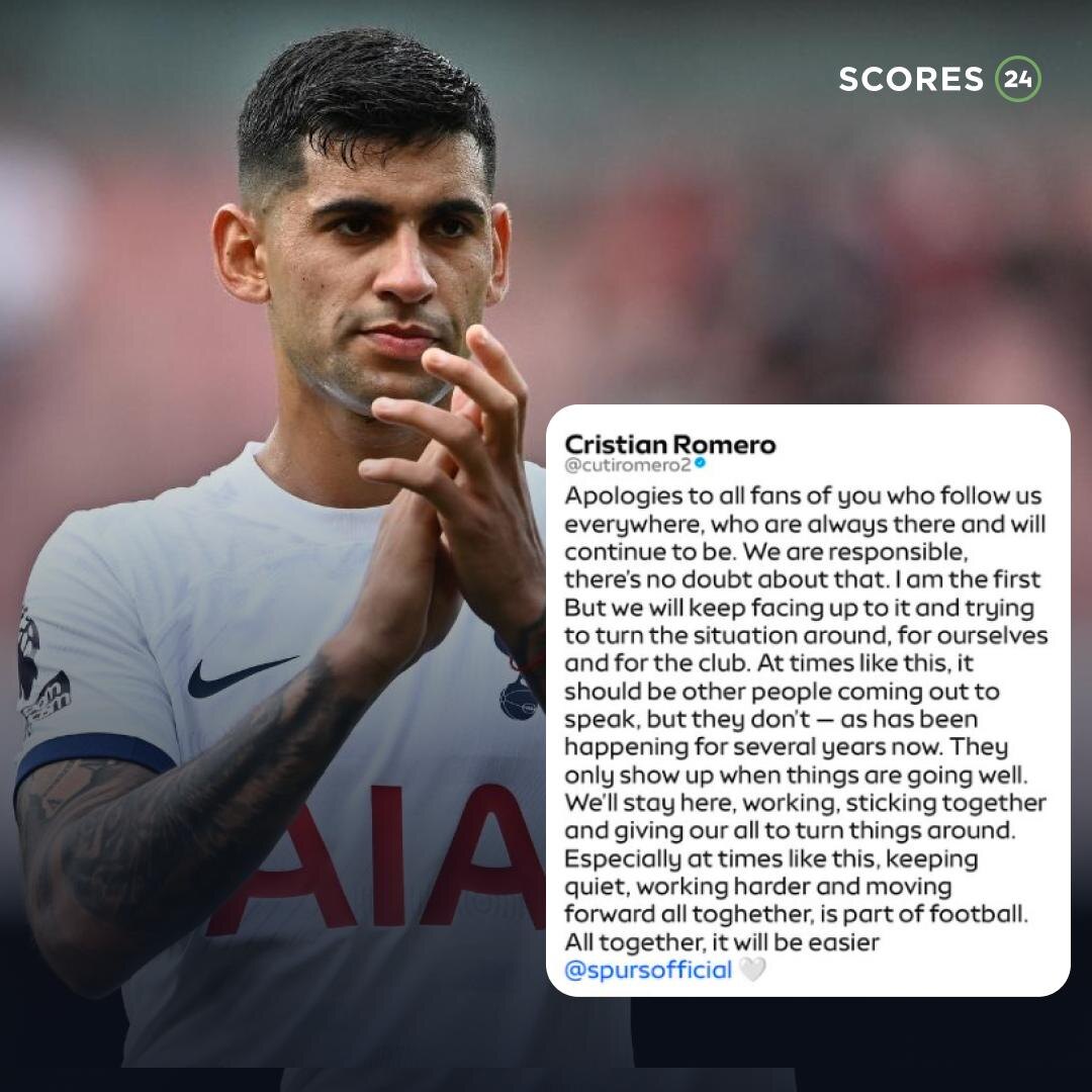 ⚽️ Защитник «шпор» публично извинился перед фанатами за текущие результаты команды и взял ответственность на себя. Ромеро подчеркнул, что именно игроки отвечают за происходящее на поле и обязаны исправлять ситуацию. При этом он дал понять, что в трудные моменты поддержку проявляют не все — многие появляются лишь тогда, когда у клуба всё хорошо. «Хочу извиниться перед всеми болельщиками, которые следуют за нами повсюду, всегда рядом и будут рядом дальше. Мы несём ответственность — без сомнений. И в первую очередь я. Но мы продолжим принимать это и пытаться изменить ситуацию — ради себя и ради клуба. В такие моменты должны выходить и говорить другие люди, но они этого не делают — так продолжается уже несколько лет. Они появляются только тогда, когда всё идёт хорошо. Мы же остаёмся здесь: работаем, держимся вместе и отдаём всё, чтобы всё исправить. Особенно в такие периоды — молчать, работать ещё усерднее и двигаться вперёд вместе — это и есть футбол. Вместе будет легче 🤍», — напис